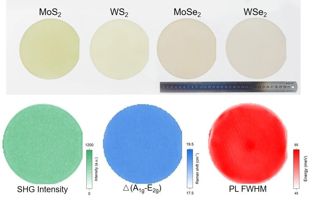 基于该技术,团队利用量产化的金属有机化学气相沉积(MOCVD)工艺,一举实现了6英寸二硫化钼、二硫化钨等四种典型二维半导体单晶的制备。材料表现出优异的均一性和电学性能,MoS2和WSe2的平均迁移率高达110cm2·V-1·s-1和131cm2·V-1·s-1。单晶尺寸、器件性能同步刷新记录,实现大尺寸与高质量兼得。