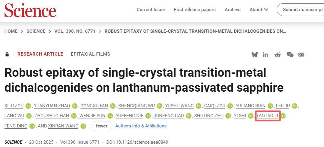 10月23日,学部2012届硕士毕业生、现南京大学副教授李涛涛团队在国际上率先实现6英寸二维过渡金属硫族化合物半导体单晶的量产化制备。相关成果以“Robust epitaxy of single-crystal transition-metal dichalcogenides on lanthanum-passivated sapphire”为题,发表于Science期刊。李涛涛校友为论文共同通讯作者。